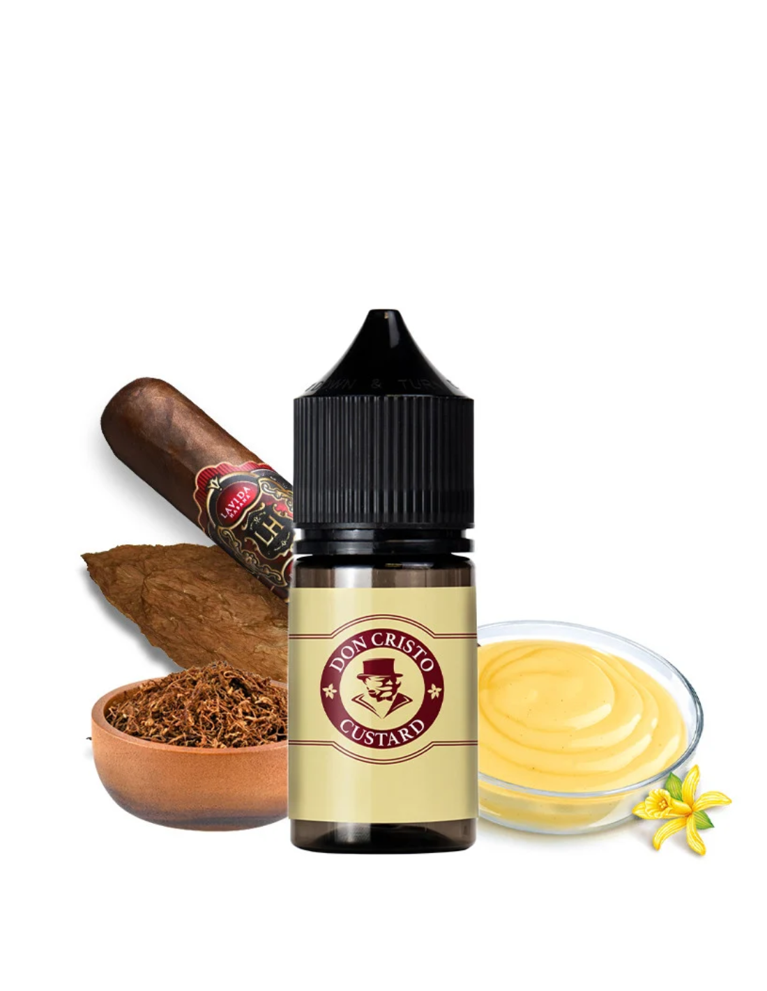 Don Cristo Custard est un arôme concentré DIY signé PGVG Labs, réservé aux amateurs de recettes complexes et équilibrées. Cette création marie à merveille un macérat authentique de tabac cubain, riche et profond, à une crème custard onctueuse et légèrement sucrée.