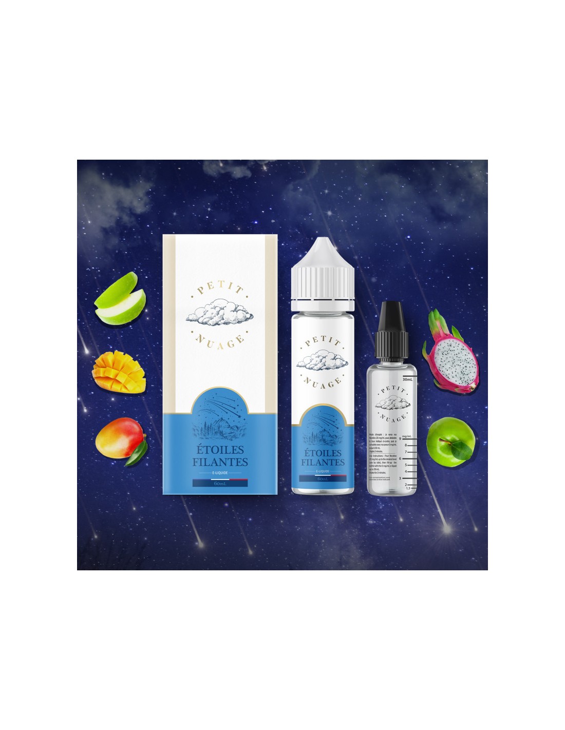 Profitez de chaque inhalation de ce mélange harmonieux et laissez-vous envoûter par l'alliance subtile de l'infusion, de la pomme, du fruit du dragon et de la mangue. Etoiles Filantes de Petit Nuage est l'e-liquide idéal pour ceux qui cherchent à ajouter une touche de magie et de sophistication à leur expérience de vape quotidienne.